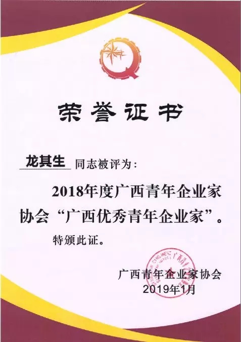 喜訊!華業(yè)集團(tuán)董事長(zhǎng)龍其生榮獲2018年“廣西優(yōu)秀青年企業(yè)家”榮譽(yù)稱號(hào)!